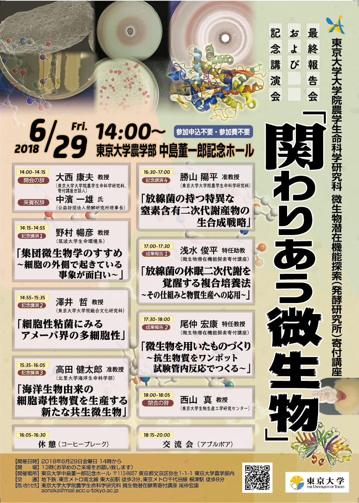 本学農学部 中島ホールにおいて開催された東京大学大学院農学生命科学研究科 微生物潜在機能探索 (発酵研究所) 寄付講座 最終報告会および記念講演会「関わりあう微生物」で勝山准教授が講演を行いました。 ポスター